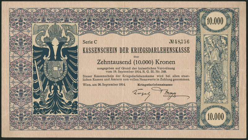 Kriegsdarlehenskasse Kassenschein (War State Loan Bank), 10000 kronen, 26 September 1914, serial number 48756, lilac and pink and dark green, double headed eagle at left, three allegorical maidens at right, reverse pink-brown, text
