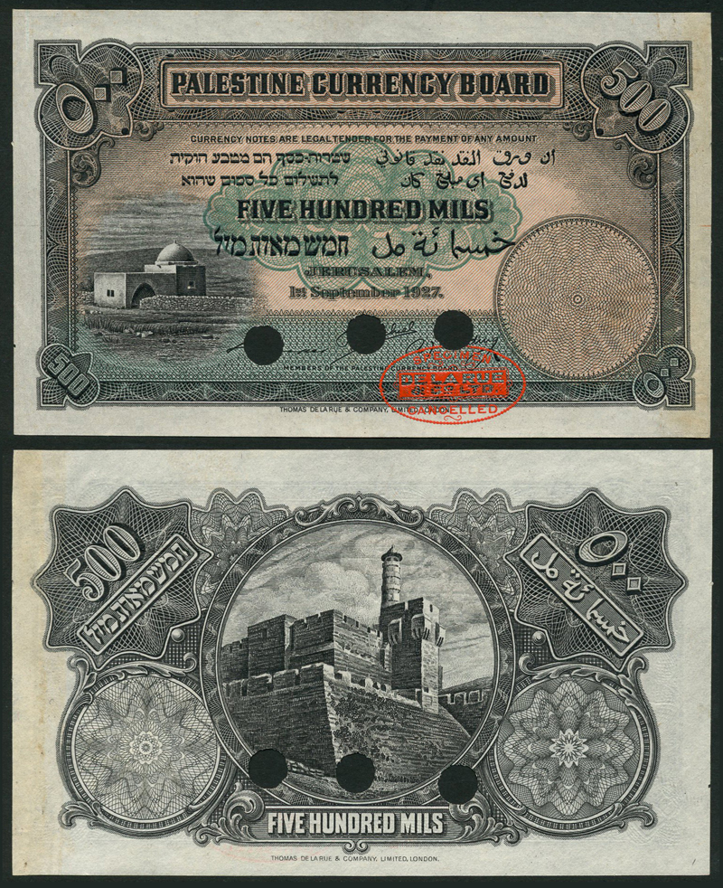 Palestine Currency Board, colour trial 500 mils, 1 September 1927, purple and pale green and pink, Rachel´s Tomb near Bethlehem at left, Couper, Ezechiel and Harding signatures, reverse the Tower of David and the citadel of Jerusalem at centre, value top left and right