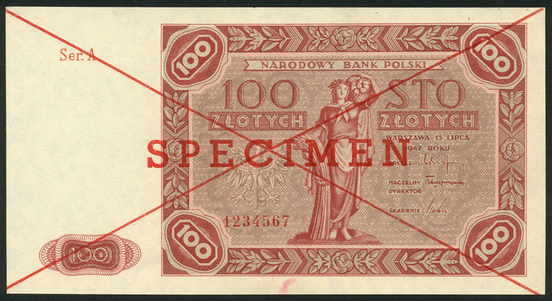 Narodowy Bank Polski, specimen 100 zlotych, 1947, red serial number A 1234567, red, maiden and cornucopia at centre, value at left and right, reverse red, horses
