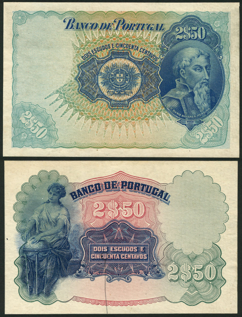 Banco de Portugal, an obverse and reverse colour trial/proof 2 and 1/2 escudos, ND (1920), blue, green and multicoloured, Pereira at right, arms at centre, reverse blue and purple, maiden and globe at left