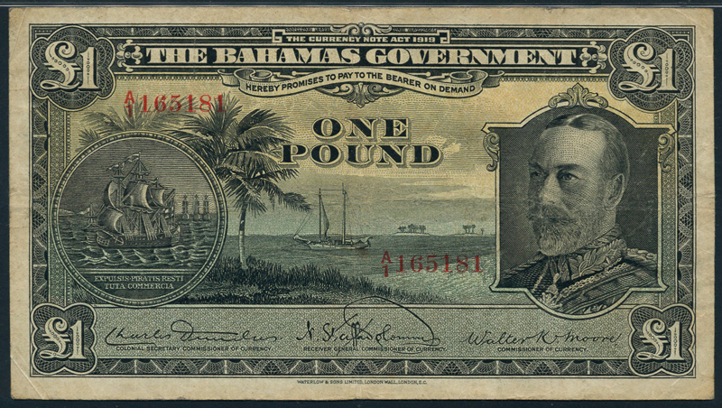 Bahamas Government, £1, ND (1919), red serial number A/1 165181, black and pale yellow, George V at right, ship seal at left, reverse brown, arms at centre
