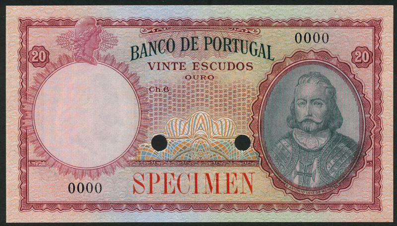 Banco de Portugal, colour trial 20 escudos, Ch 6 (ca 1941), red-brown and multicoloured, two issued examples in green and multicoloured and dated 1951 and 1954 respectively, also a specimen, ND, same design in green and multicoloured, all De Menezes at right, head of Liberty top left