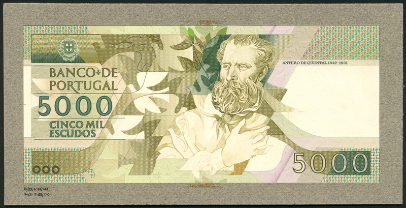 Banco de Portugal, an obverse and reverse composite essay on card for a 5000 escudos, Ch 1, ND (1977), dark brown and multicoloured, Antonio Sergio at left, arms at right, reverse Antonio Sergio at centre, value at right, also an obverse and reverse composite essay for a 5000 escudos, ND (1973), green, De Quental at right centre, reverse green, hands and chains