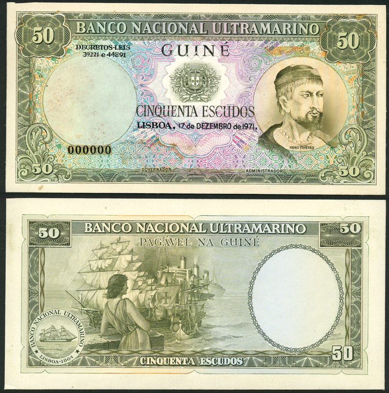 Banco Nacional Ultramarino, Portuguese Guinea, an obverse and reverse composite essay for a 50 escudos, 17 December 1971, zero serial numbers, green and multicoloured, arms at centre, Tristao at right, reverse green, maiden and ships