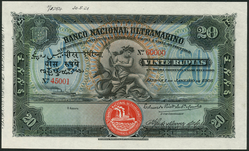 Banco Nacional Ultramarino, specimen 20 rupias, 1 January 1906, red serial number 45001-60000, black, blue and multicoloured, maiden at centre on hippocamp, value at left and right, red steamship seal III low centre, arms top left