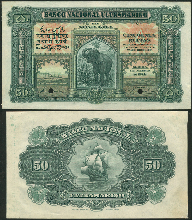 Banco Nacional Ultramarino, uniface obverse and reverse colour trial 50 rupias, 1 January 1924, green and pale red, elephant at centre, steamship low left, arms low centre, value in red sunburst top left and right, column at left and right, reverse green, galleon at centre, value at left and right