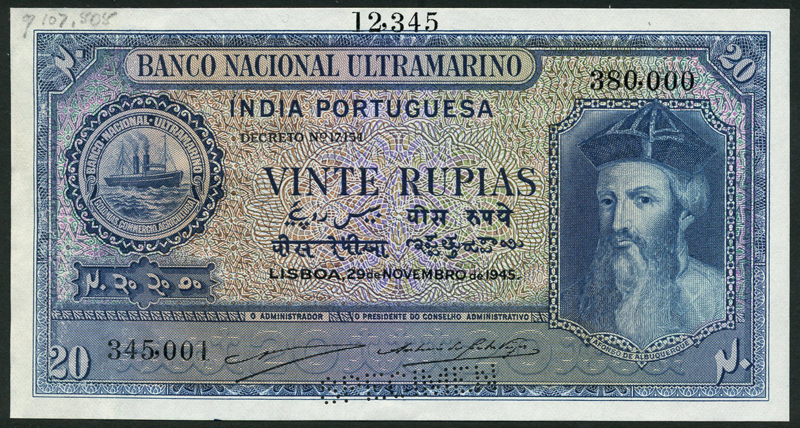 Banco Nacional Ultramarino, Portuguese India, specimen 5 rupias, green, 10 rupias, brown, 20 rupias, blue, all 29 November 1945, all Afonso de Albuquerque at right, ship seal at left, signatures A4/P2