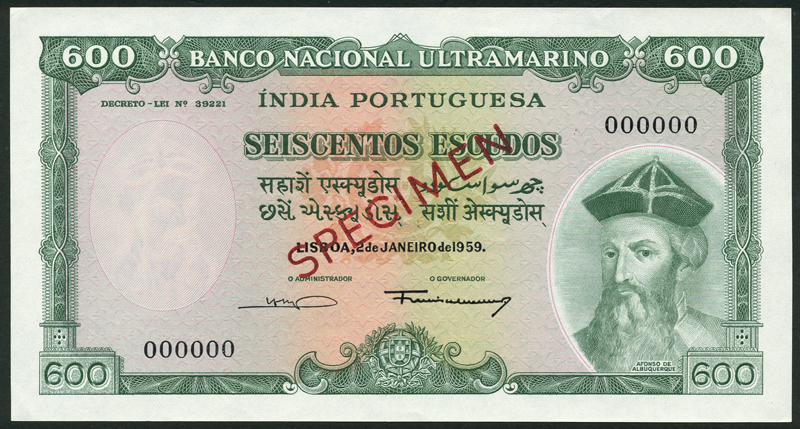 Banco Nacional Ultramarino, Portuguese India, specimen 300 escudos, purple, specimen 600 escudos, green, both 2 January 1959, zero serial numbers, both Afonso de Albuquerque at right
