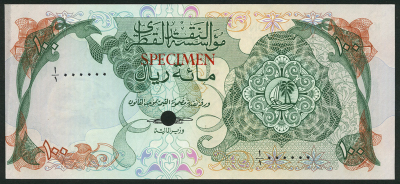 Qatar Monetary Agency, specimen 100 riyals, ND (1973), black zero serial numbers, green and orange-brown on multicolour underprint, dhow and palm tree at right, value at each corner, reverse pink, Ministry of Finance building at left centre