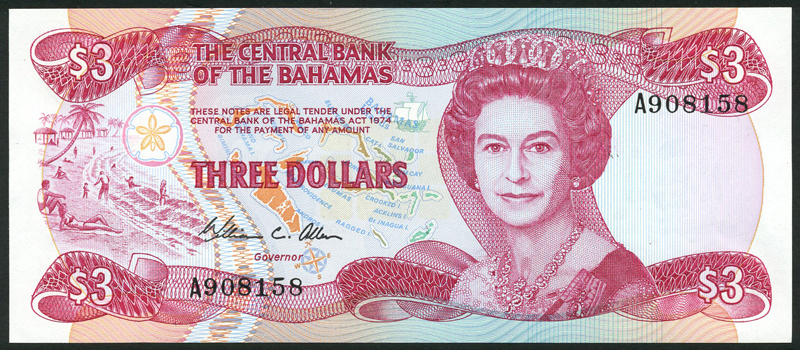 Central Bank of the Bahamas, $1 (5), L.1974 (1984), consecutive serial numbers B249586-91, green, $3 (5), L.1974 (1984), consecutive serial numbers A908158-62, red, both Elizabeth II at right, value at each corner, also $1 (5), ND (1992), consecutive serial numbers C888170-74, blue and multicolour, Columbus at right,