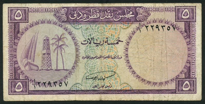 Qatar and Dubai Currency Board, 1 riyal (2), green, 5 riyals, violet and 10 riyals, blue-grey, all ND (1960), all dhow, derrick and palm at left