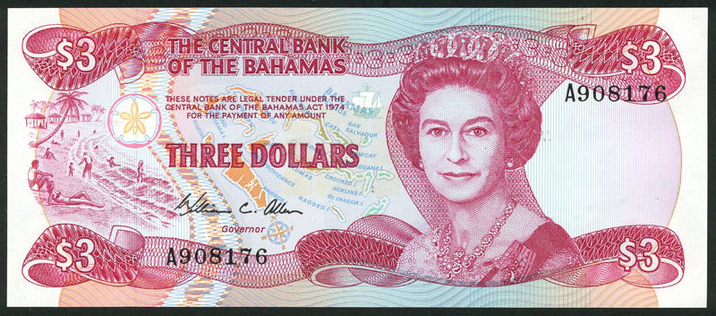 Central Bank of the Bahamas, $1 (8), law of 1974, serial numbers B 249592-599, green, Elizabeth II at right, Allen signature , also $3 (5), serial numbers A 908176-180, red, Elizabeth II at right, Allen signature also Central Bank $1 (4), ND (1992), blue, Columbus and the first landfall