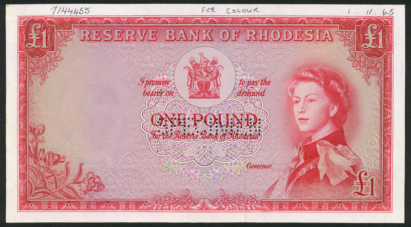Reserve Bank of Rhodesia, specimen £1 (3), ND, September 1955 and October 1955, first no serial numbers, second prefix G/14, third prefix G/15, red and lilac and pale green, Elizabeth II at right, arms top centre, Bruce signature, reverse red, Victoria Falls left centre