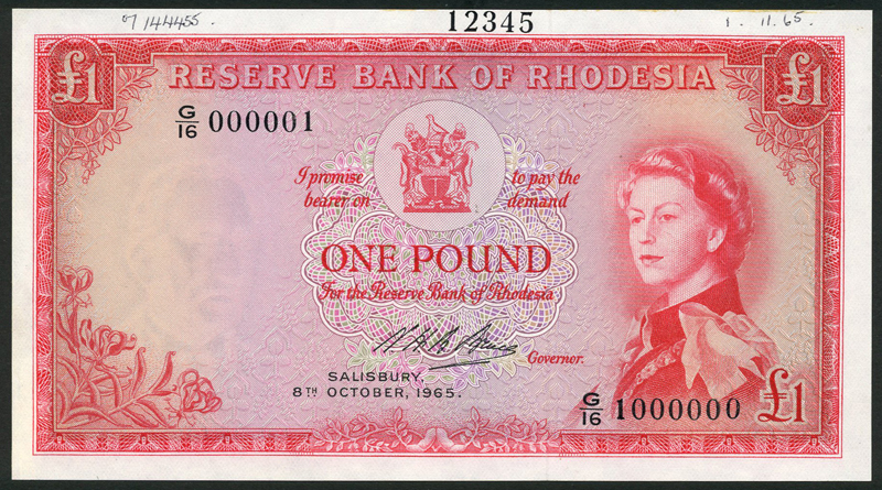 Reserve Bank of Rhodesia, specimen £1 (3), all October 1955, serial numbers G/16, G/17 and G/18 000001-1000000 respectively, red and lilac and pale green, Elizabeth II at right, arms top centre, Bruce signature, reverse red, Victoria Falls left centre