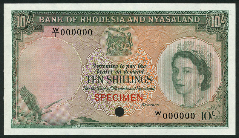Bank of Rhodesia and Nyasaland, colour trial 10 shillings, prefix W/1, green and multicoloured, also colour trial £1, blue and multicoloured, prefix X/15, both ND (ca 1956), both Elizabeth II at right, arms top centre, eagle and leopard low left respectively