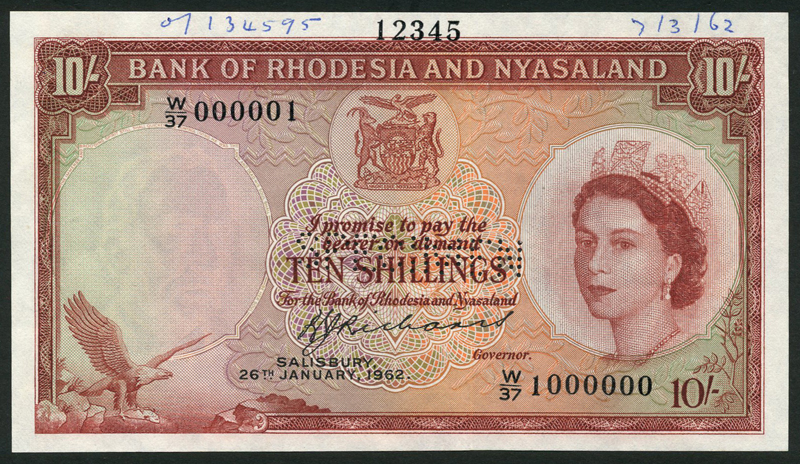 Bank of Rhodesia and Nyasaland, specimen 10/-, ND and no serial numbers or signature (type of 1961), red-brown and pale green, Elizabeth II at right, eagle low left and arms top centre, also specimen 10/- (2), 1962, prefixes W/36 000001-1000000 and W/37 000001-1000000, both Richards signature