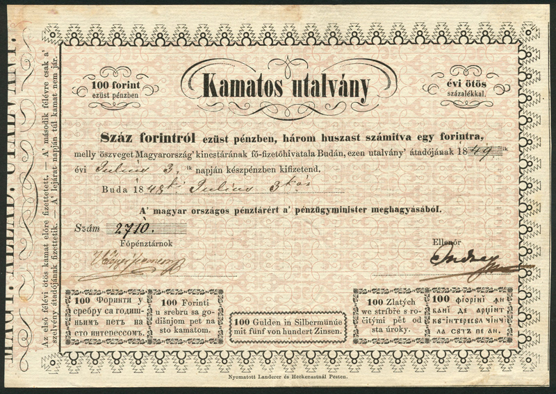 Kamatos Utalvany (Interest-Paying Legal Tender Paying Bills) 100 fiorint, 1848, serial number 2710, black text on pale pink background, manuscript signature low left and right, reverse interest table