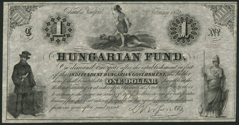 Hungarian Fund, $1 (12), 2 February 1852, red consecutive serial numbers 28021-32, black and white, L. Kossuth at low left, Liberty at right, Hungaria at top centre