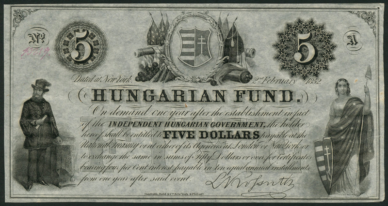 Hungarian Fund, $5 (5), 2 February 1852, serial letter A, consecutive numbers 13259-61 and 13265-66, black and white, black and white, L. Kossuth at low left, Liberty at right, arms at top centre