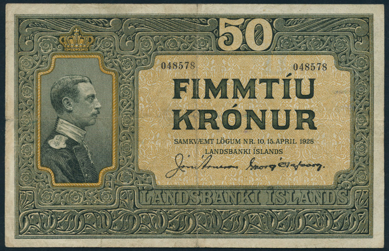 Landsbanki Islands, 50 kronur, 15 April 1928, serial number 048578, grey-green on light brown underprint, King Christian X at left, value at top right