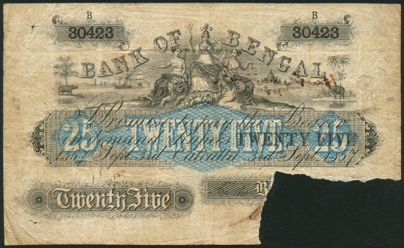 Bank of Bengal, 25 rupees, 3 August 1857, serial number 30423, black on blue underprint, allegorical maidens at top centre, flanked by animals, ships and palace, value at centre and left and right, reverse blue