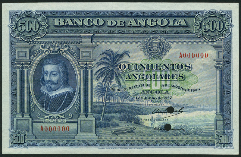 Republica Portuguesa, Angola, colour trial 500 angolares, 1 June 1927, red serial number A 000000, blue and green, Salvador Correia at left, shoreline and palm trees at centre, value right centre and at each corner, arms top right centre, reverse blue, eagle