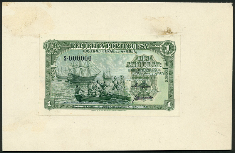 Republica Portuguesa, Angola, an obverse composite essay on board for a 1 angolar, 28 March 1942, serial number Sr 000000, green, Dutch prisoners and galleons in Luanda, arms top left