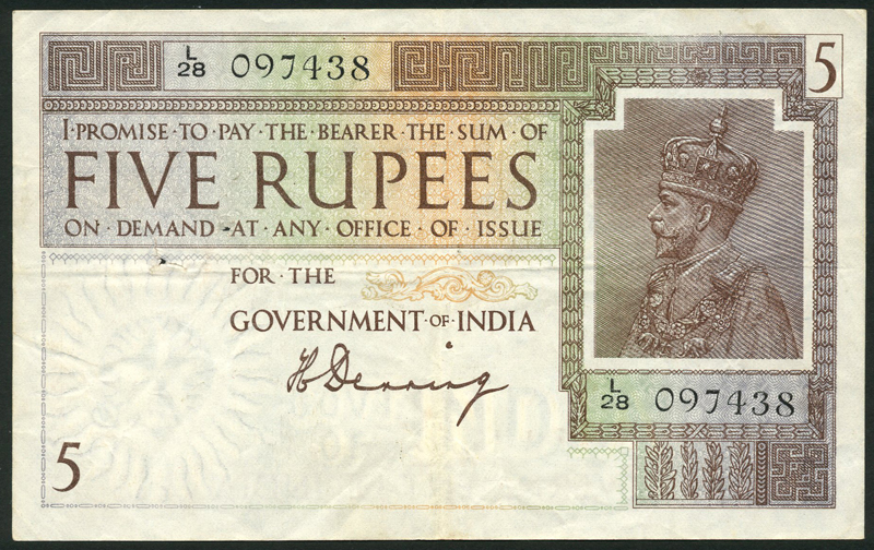 Government of India, 5 rupees, ND (1925), serial number L/28 097438, white, purple, pale green and orange, George V at right, Denning signature