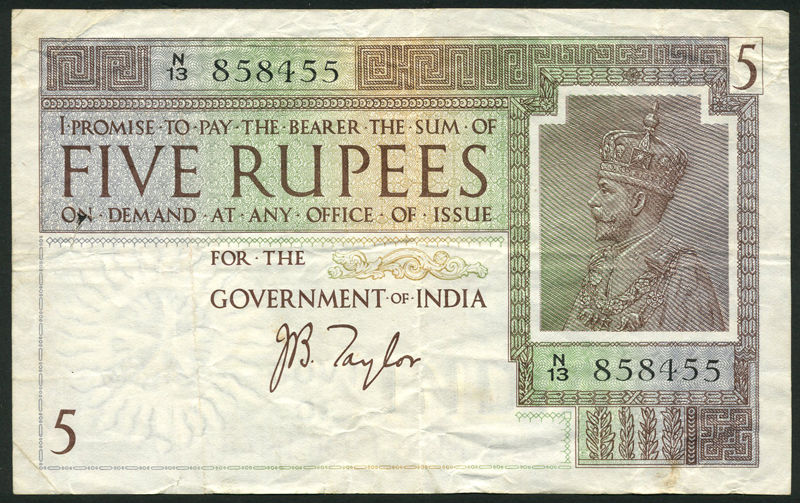 Government of India, 5 rupees, ND (1925), serial number N/13 858455, white, purple, pale green and orange, George V at right, Taylor signature