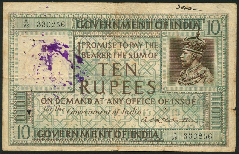 Government of India, 10 rupees, Calcutta, ND (1925), serial number A/28 330256, green and brown, George V in square frame at top right, McWatters signature low right, reverse pale green and brown, star at centre, value low left and right, also a 1 rupee, ND (1917-), prefix E, Gubbay signature