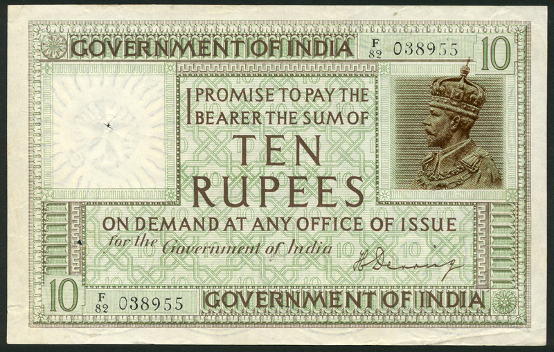 Government of India, 10 rupees, ND (1925), serial number F/82 038955, pale green and brown, George V in rectangular frame at right, watermark rayed star, Denning signature, reverse brown and pale green-blue, star and value