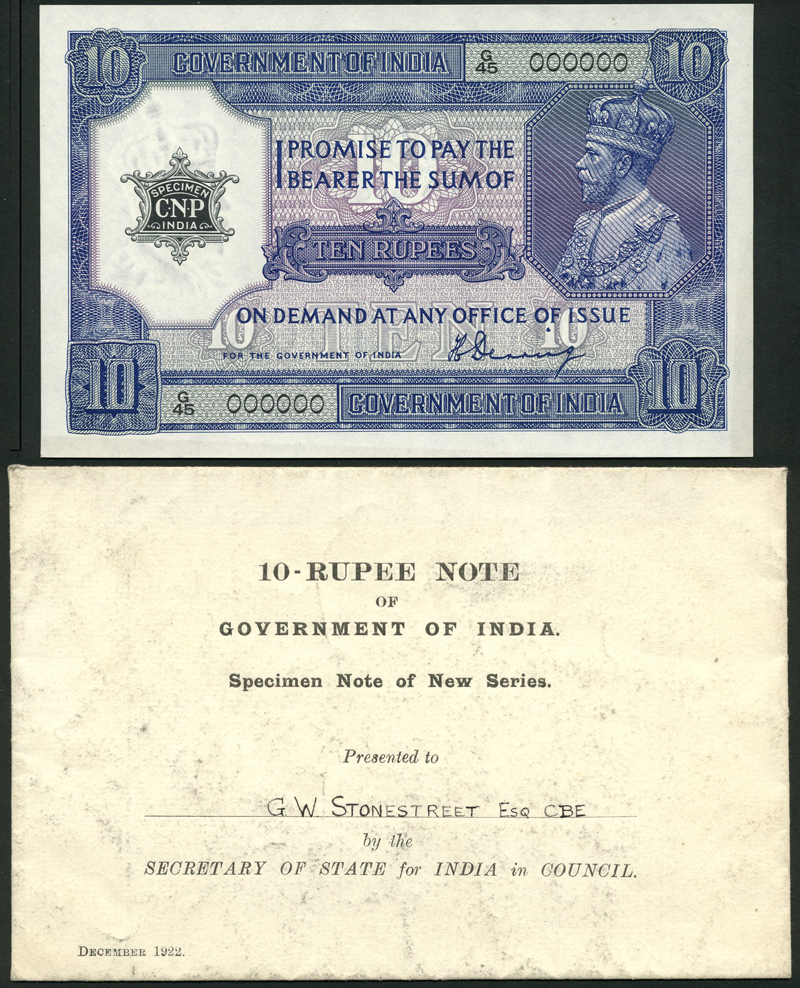 Government of India, specimen 10 rupees, ND (1922), serial number G/45 000000, blue, lilac and white, George V in octagonal frame top right, Denning signature low right, reverse blue and pale green, value at centre, star low right