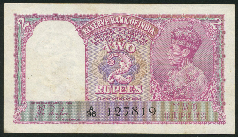 Government of India, 1 rupee (3), ND (ca 1941), blue-green, all Jones signature, George VI at right, 2 rupees. lilac, Taylor signature, George VI at right, 5 rupees, brown-green and 10 rupees, blue, both Taylor signature and George VI at right, ca 1938-, also watermarked paper for a George VI 10 rupee