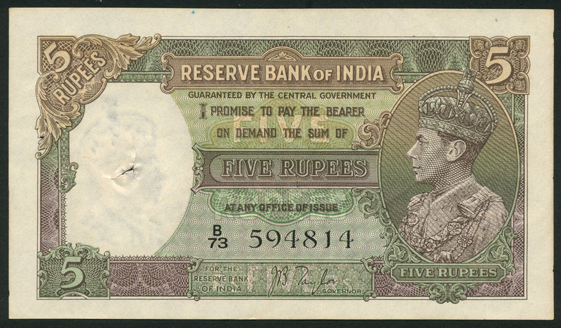 Reserve Bank of India, 5 rupees (2), ND (1937), consecutive serial numbers B/73 594814-15, brown and green, George VI at right, value at each corner