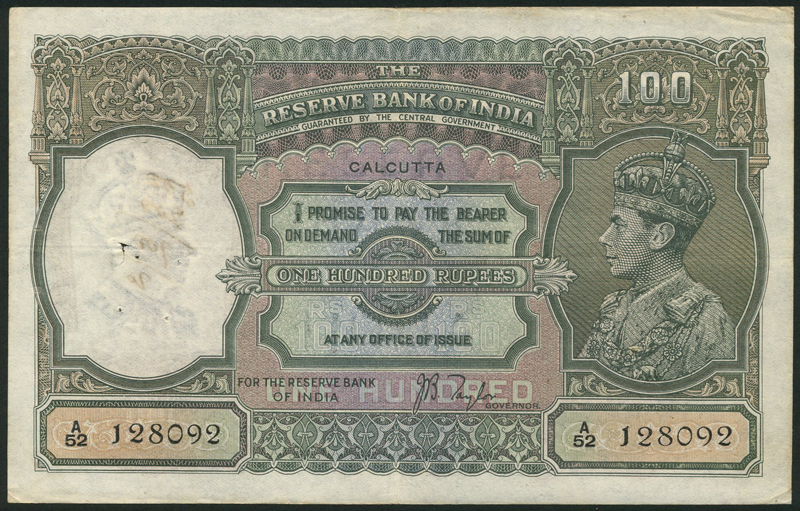 Reserve Bank of India, 100 rupees (2), ND (1937), Bombay and Calcutta, prefixes A/17 and A/52, green and lilac, George VI at right, value at centre and top right, Taylor signature