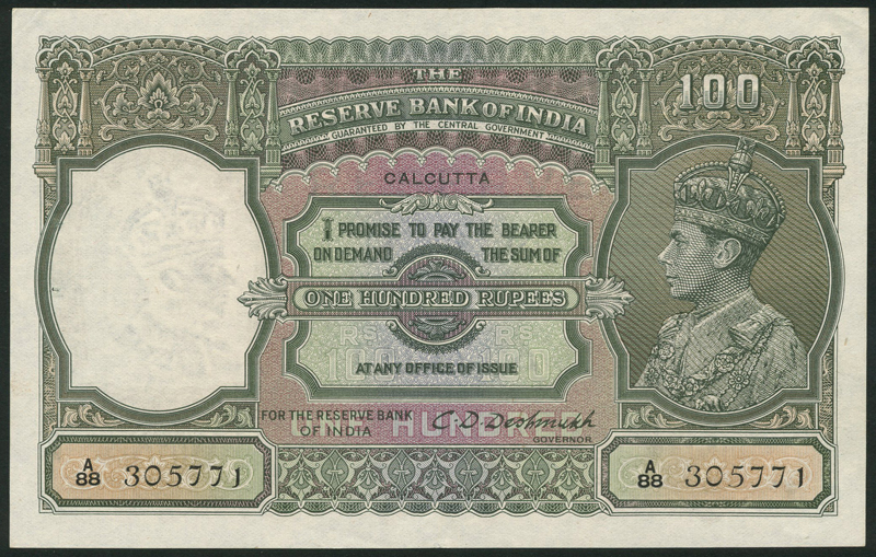 Reserve Bank of India, 100 rupees (2), ND (1937), Calcutta, serial number A/88 305771/772, green and lilac, George VI at right, value at centre and top right, Deshmukh signature