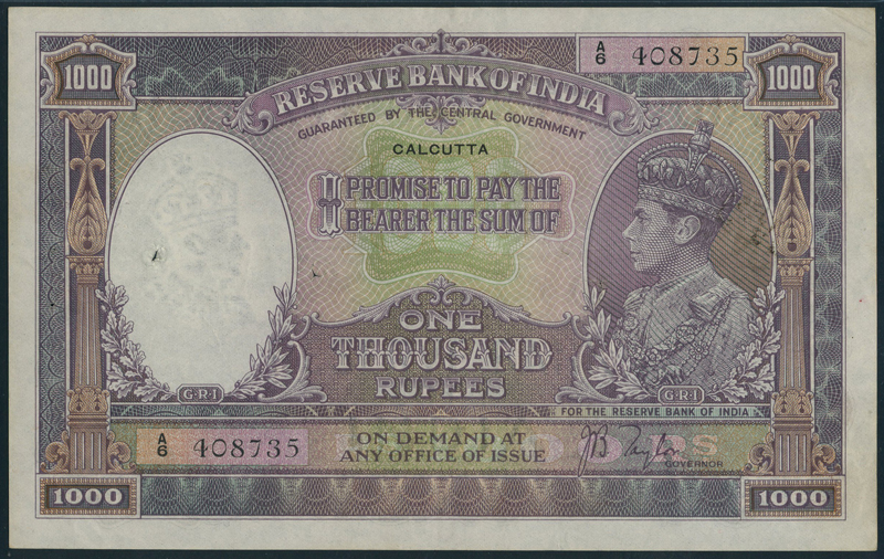 Reserve Bank of India, 1000 rupees, Calcutta, ND (1937), serial number A/6 408735, lilac, violet & green, portrait of King George VI at right, printed signature J.B.Taylor, reverse mountain scene