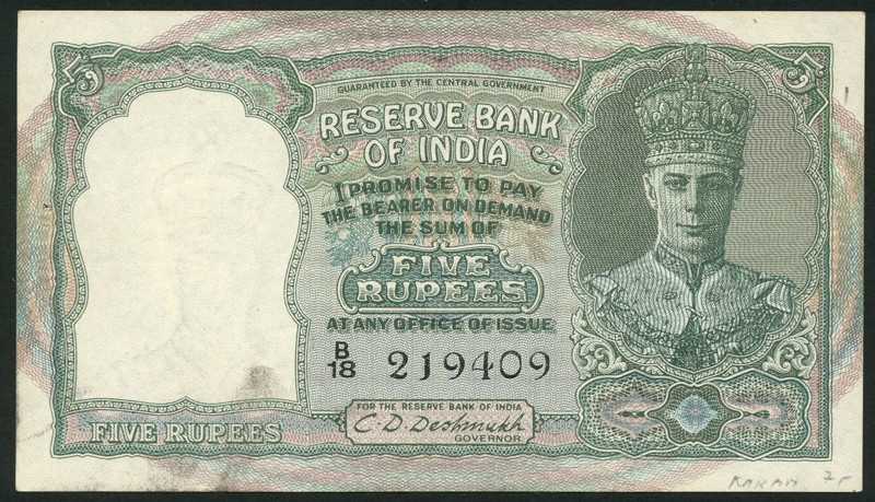 Reserve Bank of India, 5 rupees, ND (1944), black prefix B/18, green, George VI facing at right, Deshmukh signature