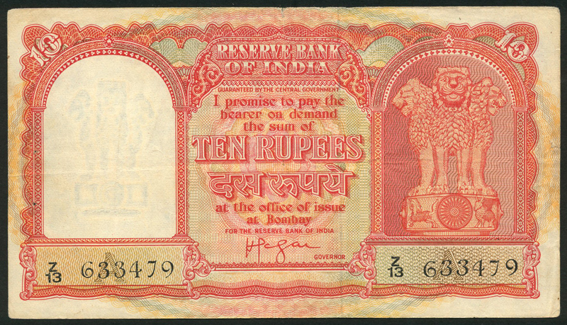Reserve Bank of India, Persian Gulf issue, 10 rupees, ND (1950´s-60´s), serial number A/13 633479, red-orange on multicolour underprint, Asoka column at right, value at centre and top corners, reverse red, dhow at centre