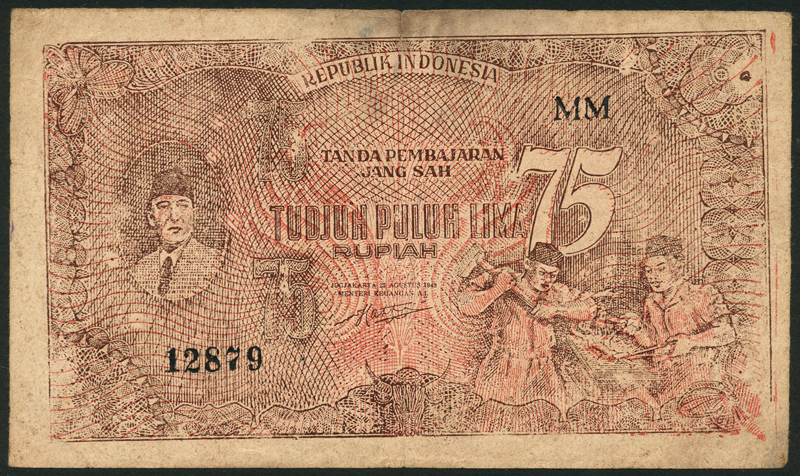 Republik Indonesia, 75 rupiah, 23 August 1943, seral number MM 12879, brown and red-brown, Sukarno at left, two smiths at right