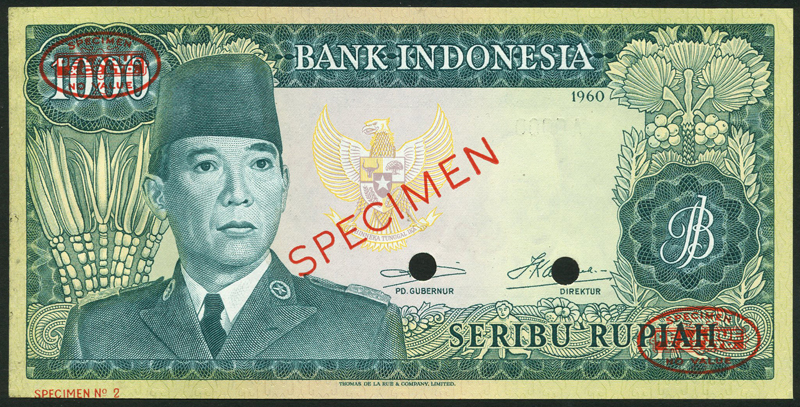 Bank Indonesia, specimen 500 and 1000 rupiah, 1960, black and pink, and green and multicolour respectively, both President Sukharno at left