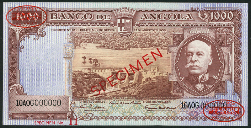 Banco de Angola, a set of specimens of the 15 August 1956 issue comprising 20 Escudos, serial number 1VA000000, lilac, Porto at right, reverse gazelles, 50 Escudos, serial number 20BO 000000, green, Carvalho at right, reverse wildebeest, 100 Escudos, serial number 10Un000000, blue, Pinto at right, reverse purple, elephants, 500 Escudos, serial number 10AN00000, red, Ivens at right, reverse, rhinoceros, and 1000 Escudos, serial number 10AOG000000, brown, Capelo at right, reverse grey, sable herd, all overprinted SPECIMEN in red or black with two De La Rue Specimen ovals on obverse and reverse