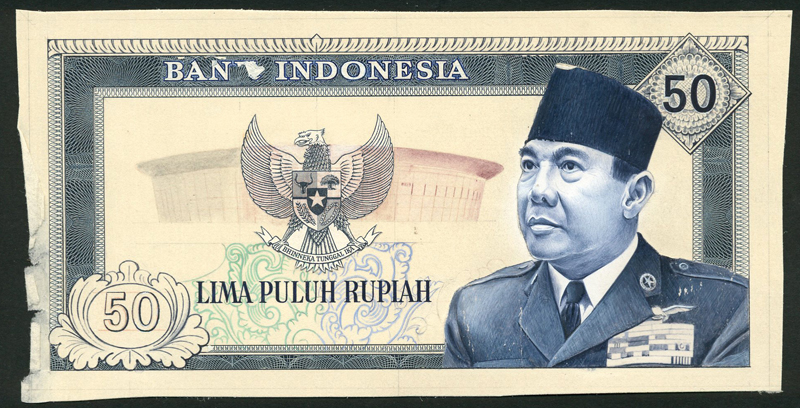 Bank Indonesia, a composite essay on board for a 50 rupiah, ND (c1960), blue, President Sukharno at right, arms at centre