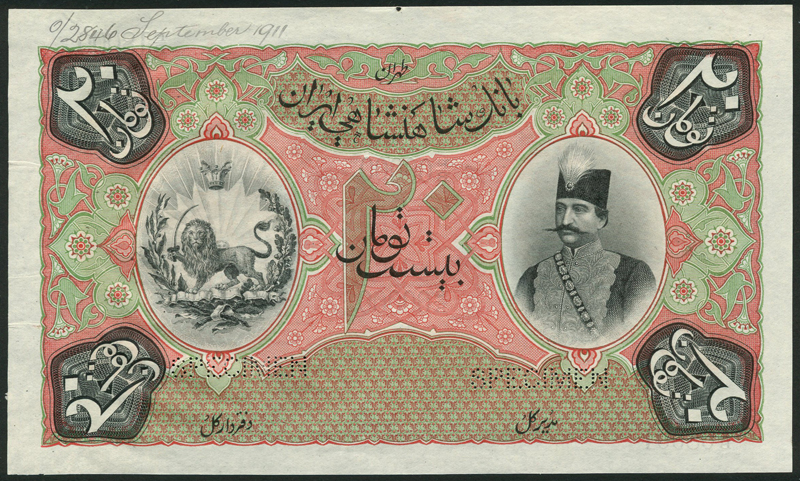 Imperial Bank of Persia, specimen 20 tomans, Teheran, ND (ca 1919), serial number F/B 08001-F/B 18000, black, pink and green, Shah Nasr-ed Din at right, arms at left, value at centre and at each corner, reverse orange-brown, arms at centre, value at centre and at each corner