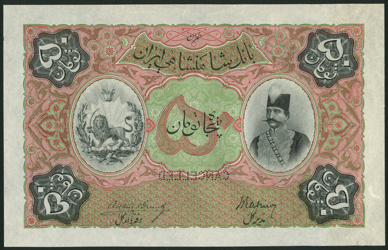 Imperial Bank of Persia, specimen 50 tomans, Teheran, ND (ca 1919), serial number H 06501-H/A 01500, black, pink and green, Shah Nasr-ed Din at right, arms at left, value at centre and at each corner, reverse brown, arms at centre, value at centre and at each corner