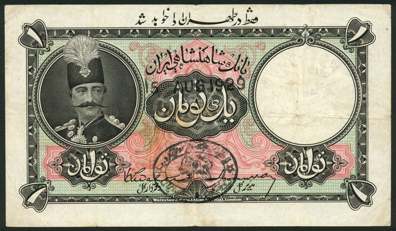 Imperial Bank of Persia, 1 toman, Teheran, 15 August 1929, serial number A/1 075297, black, pink and pale green, Shah Muzzaffar-al-Din at left, value at each corner, reverse pink and green, value at right, serial number at each corner