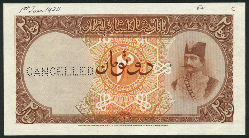 Imperial Bank of Persia, colour trial 2 tomans, ND (ca 1924), no serial numbers, brown, green and multicoloured, Shah Nasr ed-Din at right , value at centre and at each corner, reverse brown and blue, value at centre, red serial number B/A 0000000 at each corner