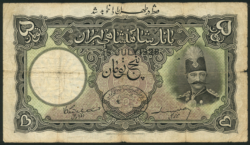 Imperial Bank of Persia, 5 tomans, Teheran, 16 July 1928, serial number C/B 077637, black, mauve and pale green, Shah Muzzaffar-al-Din at left, value at centre and at each corner, reverse green and white, value at cetre and at each corner, serial number at each corner