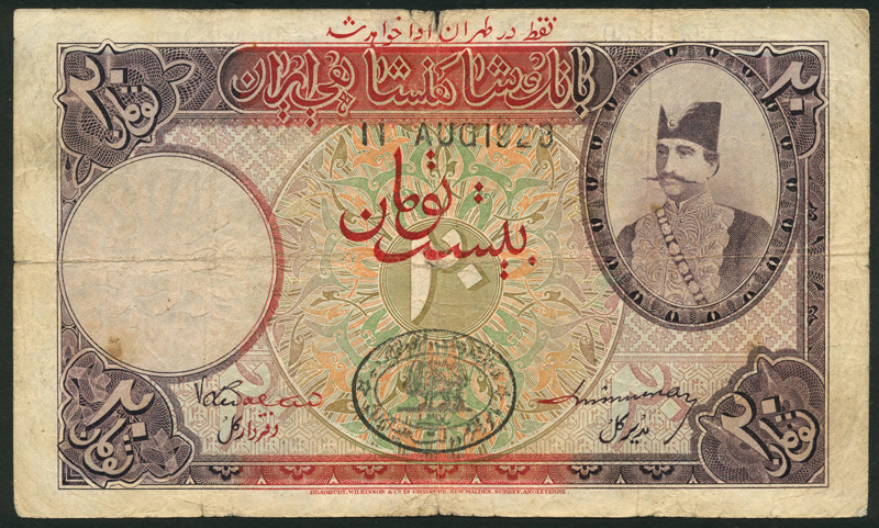 Imperial Bank of Persia, specimen 50 tomans, ND (ca 1924), no serial numbers, brown, green and multicoloured, Shah Nasr ed-Din at right centre, value at left and right, reverse brown-purple and green, arms at centre, value at left and right, ´PAYABLE AT TEHERAN ONLY´ in top margin