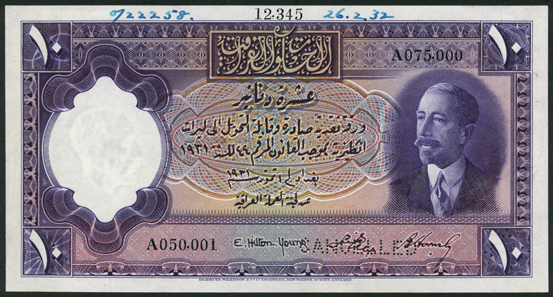 Government of Iraq, specimen 10 dinars, 1 July 1931, serial number A 050001-A075001, violet and multicoloured, King Faisal I at right, three printed signaures below, value at each corner, reverse violet and white